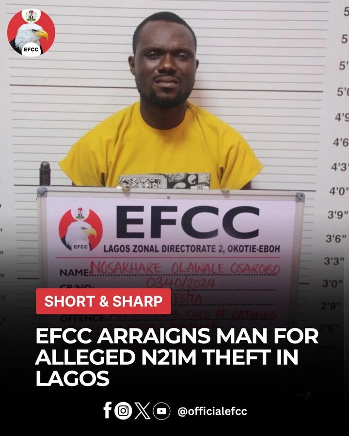 The Economic and Financial Crimes Commission (EFCC) has arraigned a Lagos-based businessman, Nosakhare Olawale, before a Lagos State High Court over an alleged N21 million fraud.