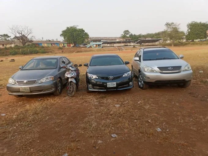 During an intensive search by operatives, several stolen items were recovered from the suspects, including a black Toyota Camry with registration number KRD 253 KC, a metallic Toyota Corolla with registration number JTA 938 AA, a silver Lexus RX 350 (unregistered), and a black Super Cargo motorcycle with registration number YRE 487 VD.